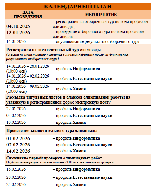 Отборочный тур стартует 04 октября 2025 года и продлится по 13 января 2026 года. Победители отборочного тура получат возможность принять участие в заключительном туре олимпиады, который состоится в феврале 2026 года в различных городах России и ближнего зарубежья. (для просмотра полного План-граифка — нажмите на картинку справа)